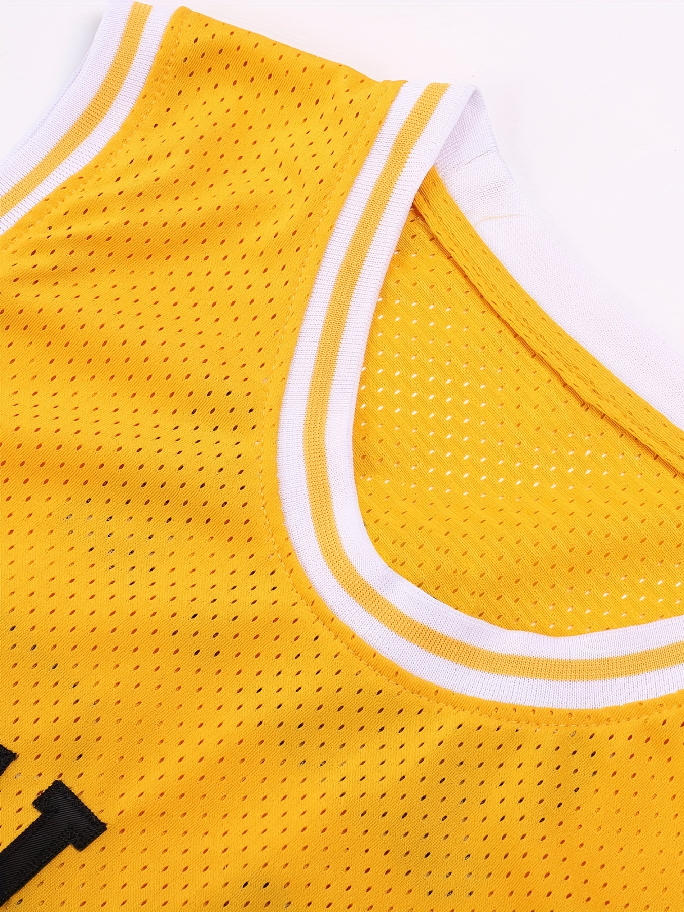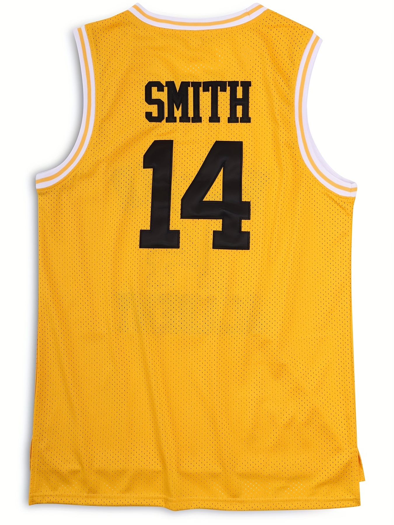Men's #14 Basketball Jersey, Yellow Retro Crew Neck Tank Top, Letters and Numbers Hand Embroidered Patchwork Breathable Sleeveless Shirt