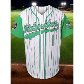 Men'S #1 White And Green Striped Baseball Jacket, Embroidered Short-Sleeve Baseball Jacket, V-Neck Loose Button-Up Shirt, Comfortable Top Suitable for Training And Games