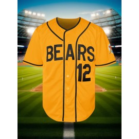 Men's #12 Classic White Baseball Jersey with Embroidered "BEARS" & Patched Blue Emblem - V-Neck, Short Sleeve, Comfortable Button-Up Shirt for Training & Games, Polyester, Machine Washable